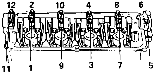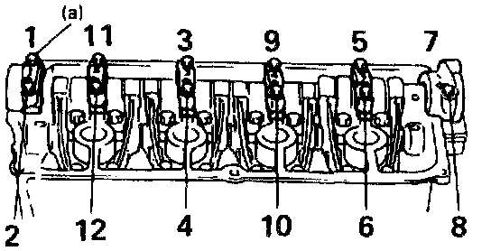 NOTE: To remove camshaft housing bolts, loosen them in such order as indicated in figure, a little at a time.