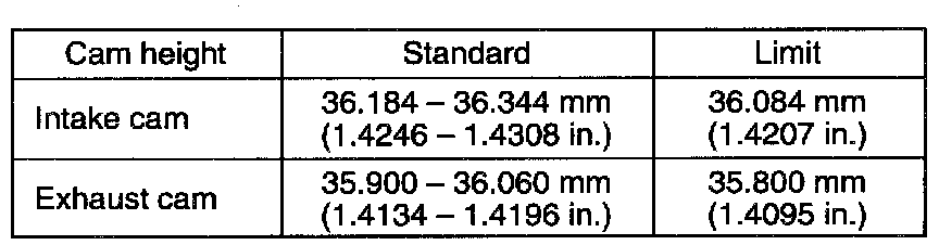 Using a micrometer, measured height of cam. If measured height is below limit, replace camshaft.