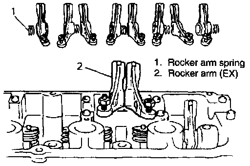 12. Remove exhaust rocker arms and rocker arm spring by pulling rocker arm shaft to front side.