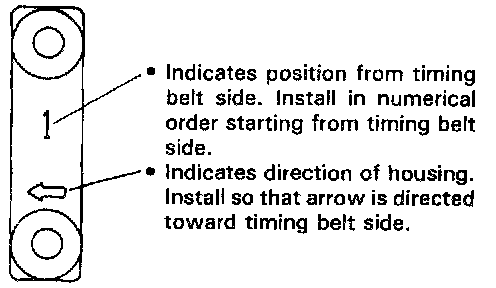 - Embossed marks are provided on each camshaft housing, indicating position and direction for installation. Install housings as indicated by these marks.