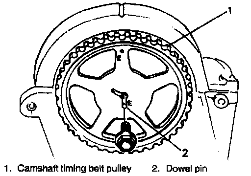 10. Install camshaft timing belt pulley to camshaft while fitting pin on camshaft into slot at "E" mark.