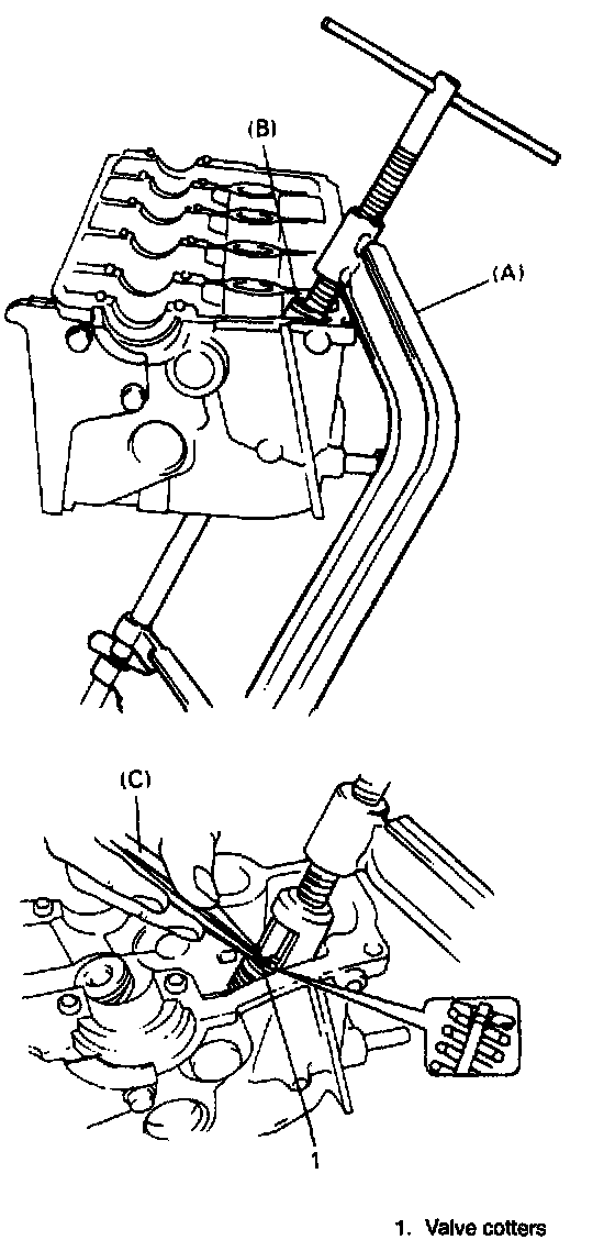3. Using special tool (Valve lifter), compress valve springs and then remove valve cotters by using special tool (Forceps) as shown.
