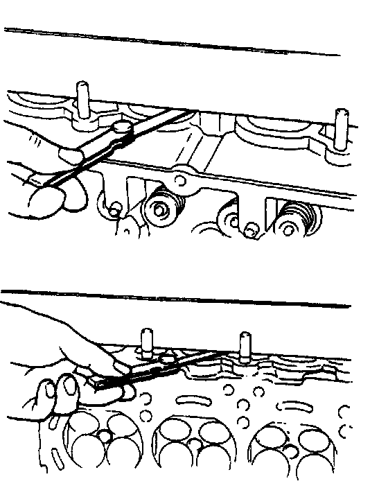 Check seating faces of cylinder head for manifolds, using a straightedge and thickness gauge, in order to determine whether these faces should be corrected or cylinder head replaced.