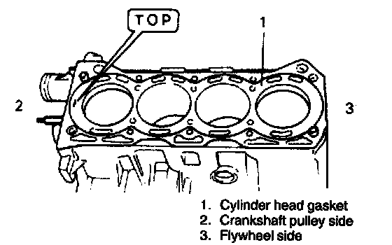 1. Remove oil gasket and oil on mating surfaces and install new head gasket as shown in figure, that is, "TOP" mark provided on gasket comes to crankshaft pulley side, facing up (toward cylinder head side).