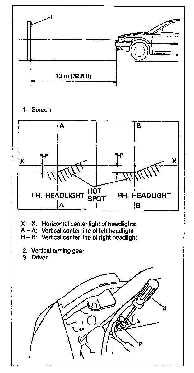 HEADLIGHT AIMING WITH SCREENNOTE: Unless otherwise obligated by local regulations, adjust headlight aiming according to following procedure.