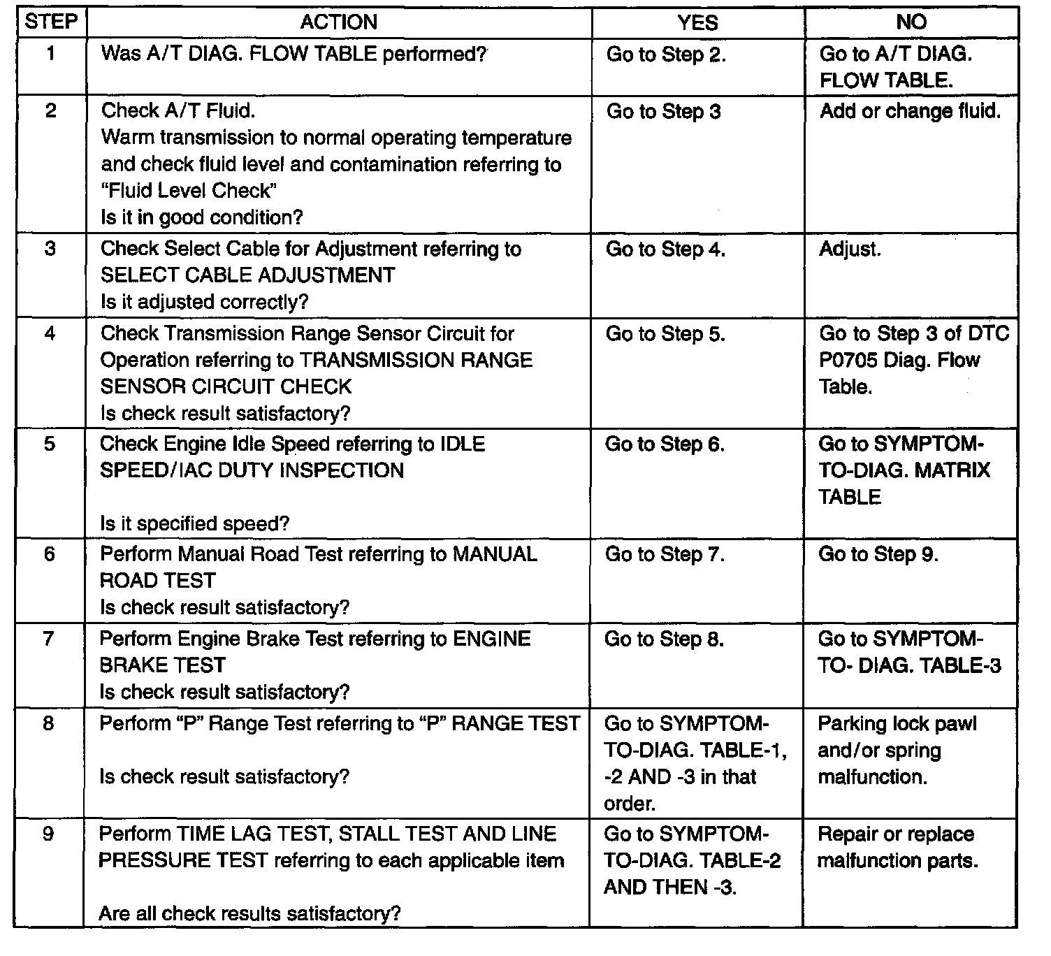 AUTOMATIC TRANSMISSION BASIC CHECKThis check very important for troubleshooting when TCM and ECM has detected no malfunction DTC and no abnormality has been found in visual inspection. Follow the flow table carefully.