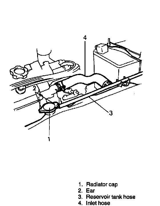 10. With engine idling, add coolant to radiator until level reaches the bottom of filler neck. Install radiator cap, making sure that the ear of cap lines up with reservoir tank hose.