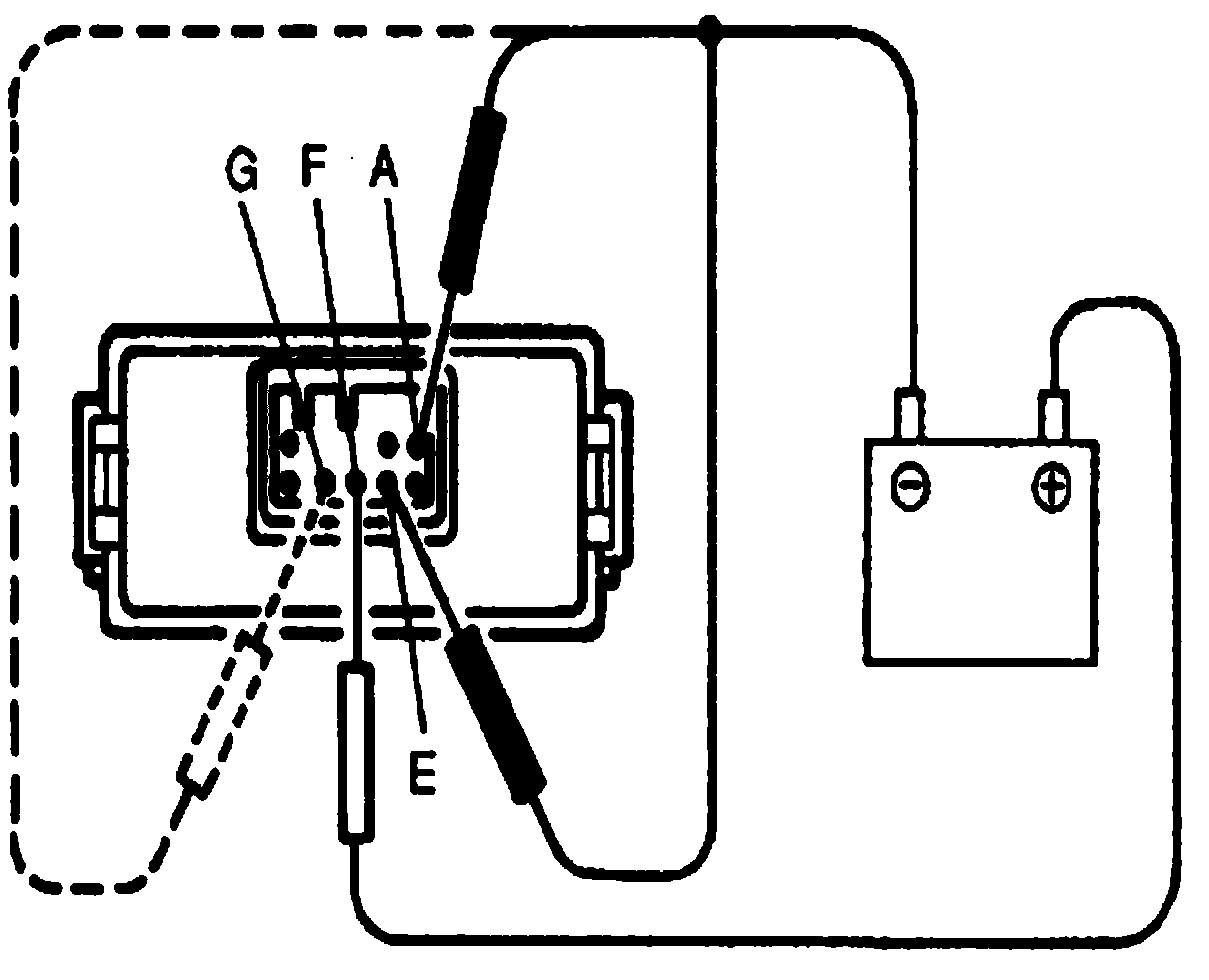 2. Connect (+) wire and (-) wire of 12 V battery to terminal "A", "E" and "F" as shown in the figure.