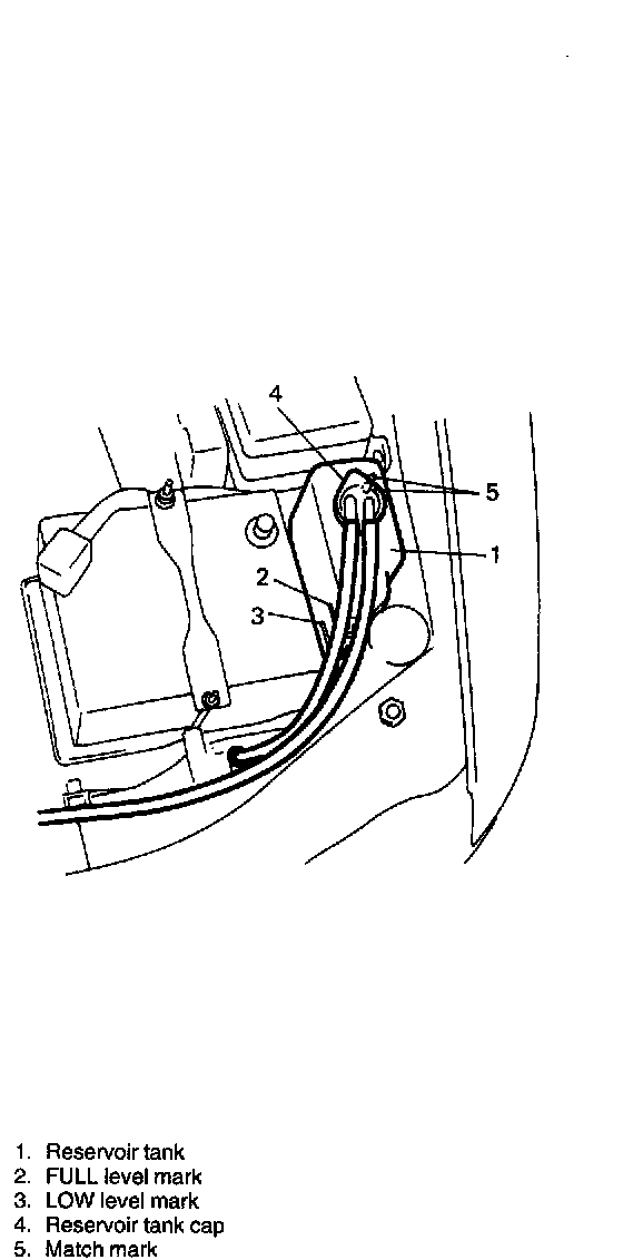 If coolant level is below "LOW" mark, remove reservoir tank cap and add proper coolant to tank to bring coolant level up to "FULL" mark. Then, reinstall cap and align match marks on tank and cap.