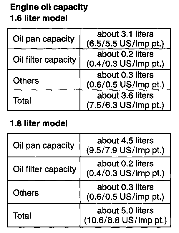 NOTE: Engine oil capacity is specified in the table. However, note that amount of oil required when actually changing oil may somewhat differ from data in table depending on various conditions (temperature, viscosity, etc.).
