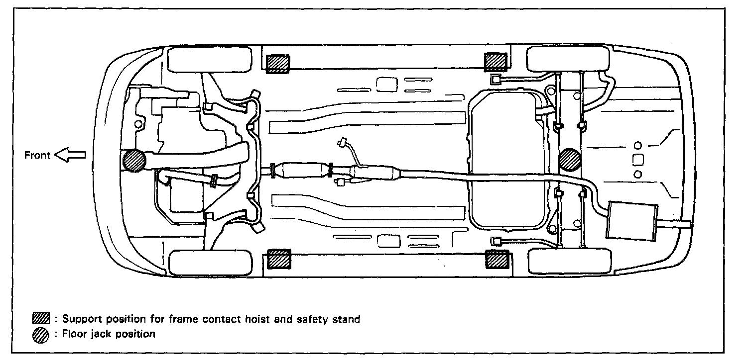 To perform service with either front or rear vehicle end jacked up, be sure to place safety stands under body so that body is securely supported. And then check to ensure that body does not slide on safety stands and the vehicle is held stable for safety's sake.