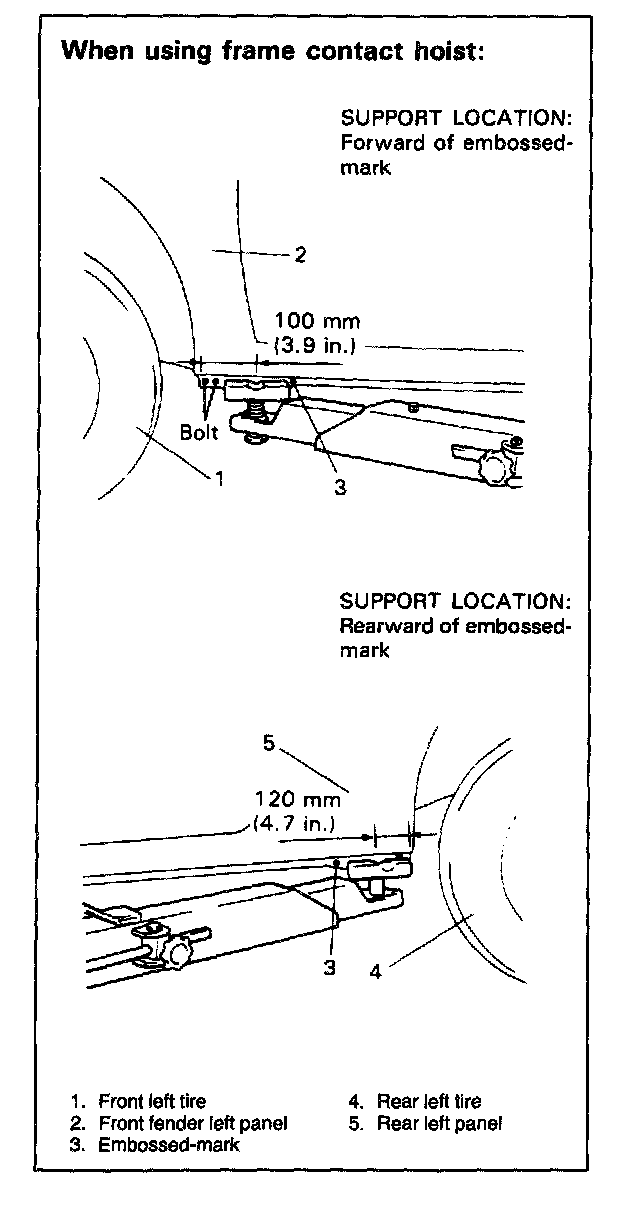 - When using frame contact hoist, apply hoist as shown in figure (right and left at the same position). Lift up the vehicle till 4 tires are a little off the ground and make sure that the vehicle will not fall off by trying to move vehicle body in both ways. Work can be started only after this confirmation.