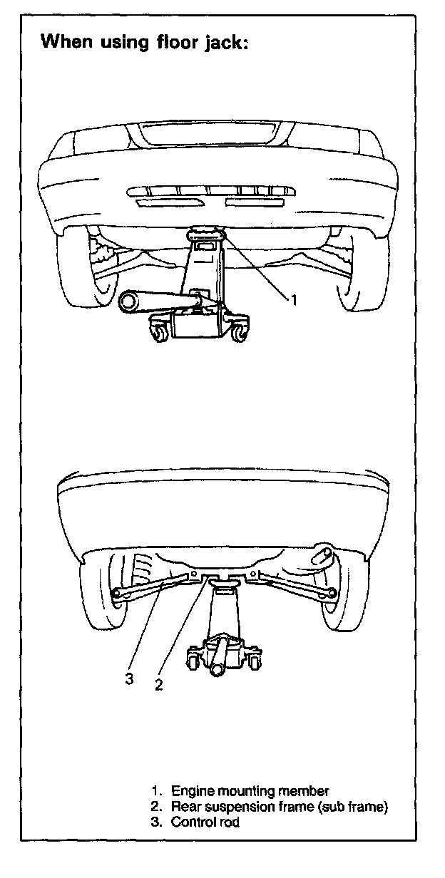 In raising front or rear vehicle end off the floor by jacking, be sure to put the jack against the front end of the engine mounting member or rear suspension frame.