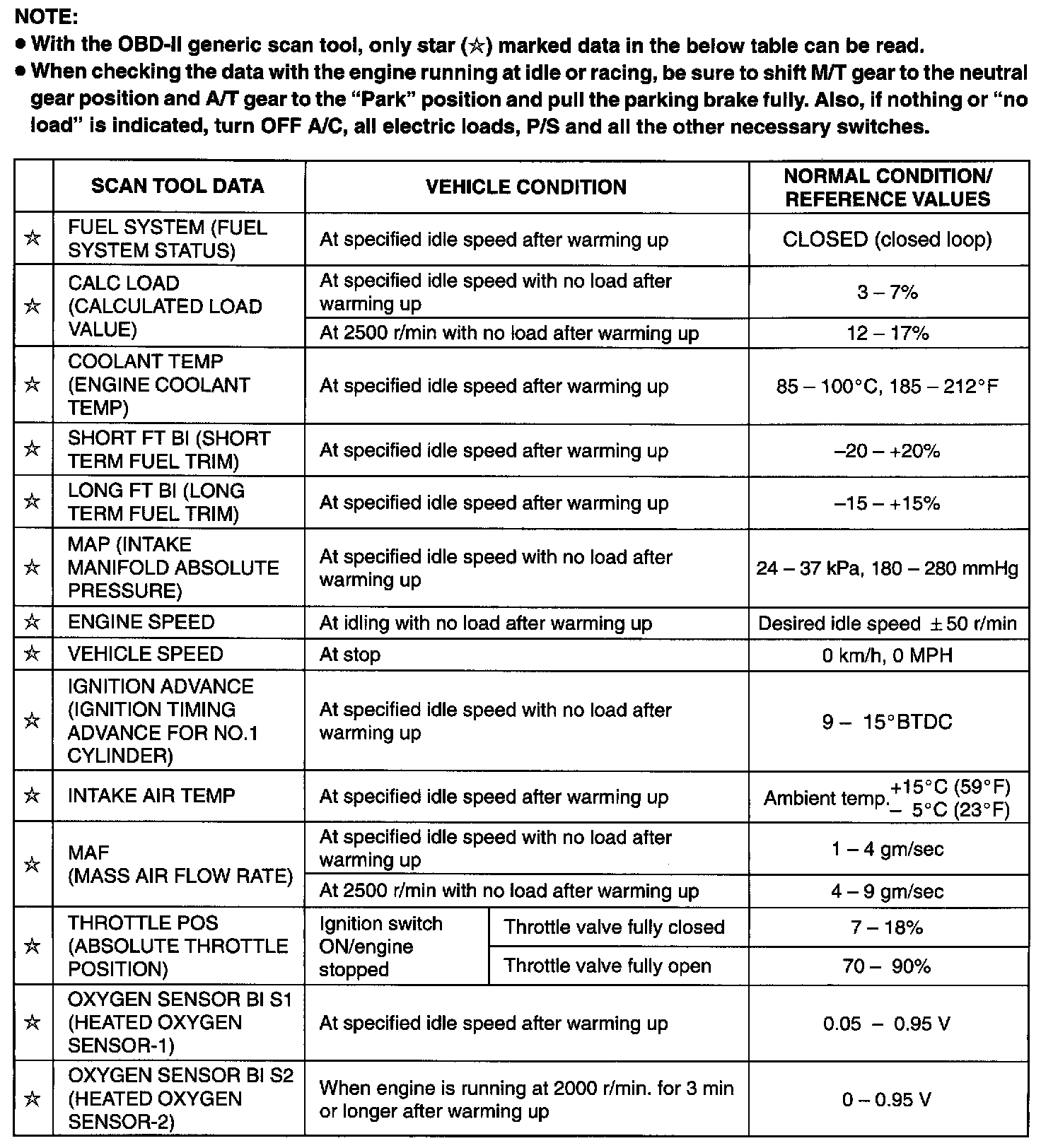 - With the OBD-II generic scan tool, only star (*) marked data in the table can be read.