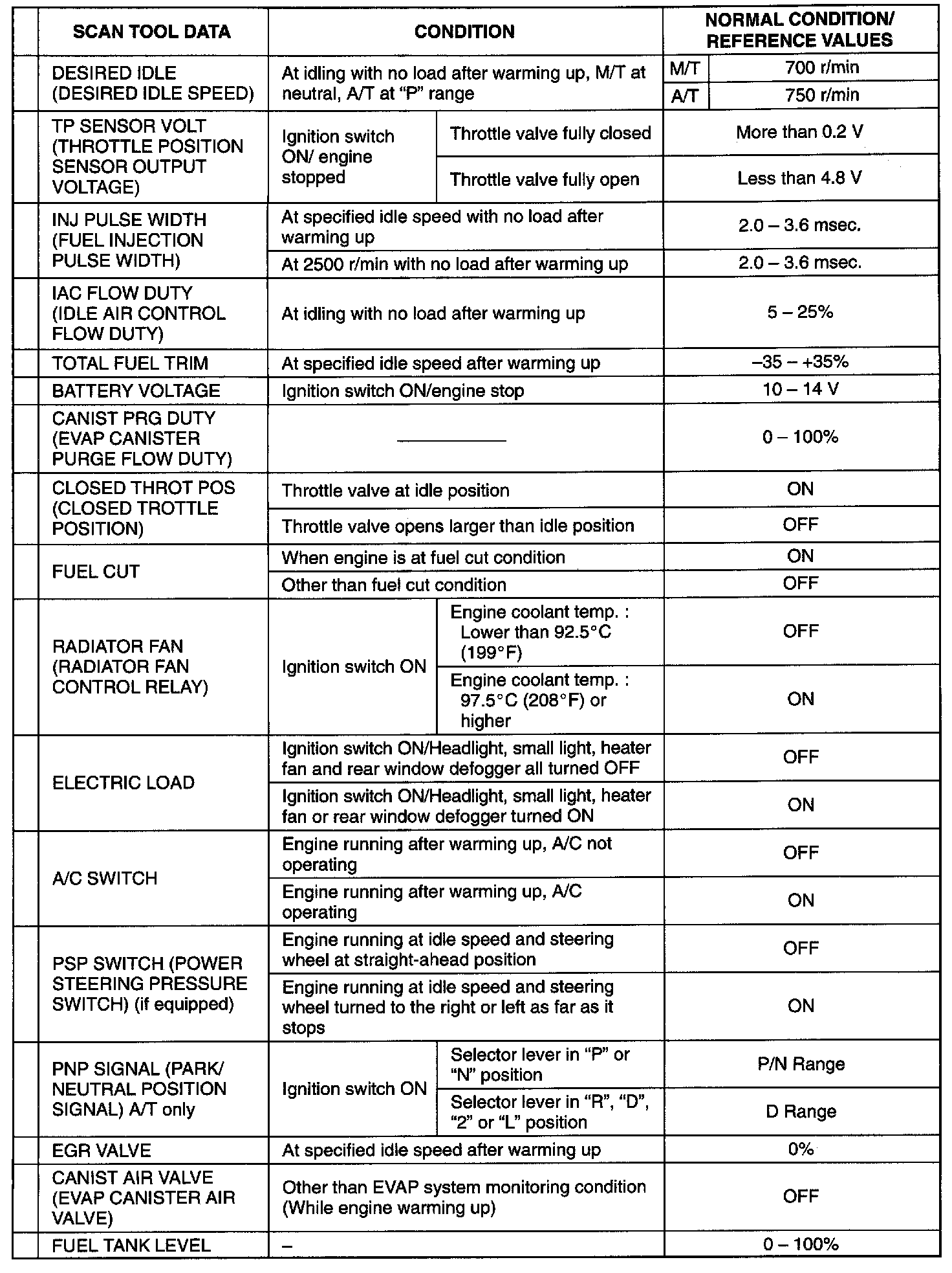 Also, conditions in the table that can be checked by the scan tool are those detected by ECM and output from ECM as commands and there may be cases where the engine or actuator is not operating (in the condition) as indicated by the scan tool. Be sure to use the timing light to check the ignition timing.