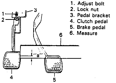Adjust clutch pedal height with adjust bolt located on pedal bracket so that clutch pedal height exceeds brake pedal height by 15 mm (0.6 inch) and tighten lock nut.