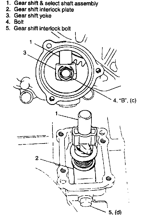 NOTE: When installing gear shift & select shaft assembly, position gear in neutral so that gear shift interlock plate will go in smoothly.