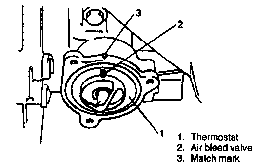 1. When positioning thermostat on water pump case, be sure to position it so that air bleed valve comes at match mark and into the recession of water pump case.