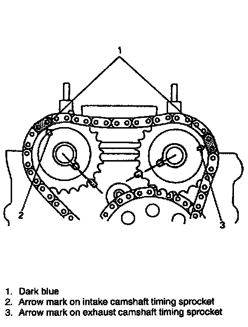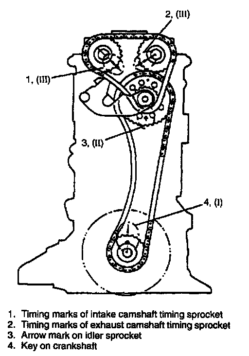 ^ Marks on sprockets (III) match with marks on cylinder head. Note that this step must be followed for reinstallation of timing chain.