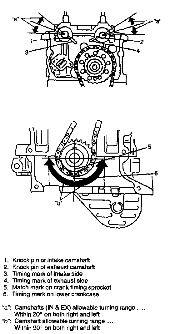 CAUTION: After 2nd timing chain is removed, never turn Intake camshaft, exhaust camshaft and crankshaft independently more than such an extent as shown. If turned, Interference may occur between piston and valves and valves themselves, and parts related to piston and valves may be damaged.