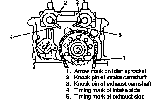 3. Check that knock pins of intake and exhaust camshafts are aligned with timing marks on cylinder head as shown in figure.