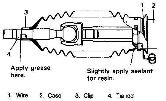 4. Position boot properly in grooves of gear case and tie rod and clamp it with wire and clip. Wire should be new and should go around twice and be tightened with its both ends twisted together. The twisted ends should be bent in the circumferential direction. After this, check to ensure that boot is free from twist and dent.