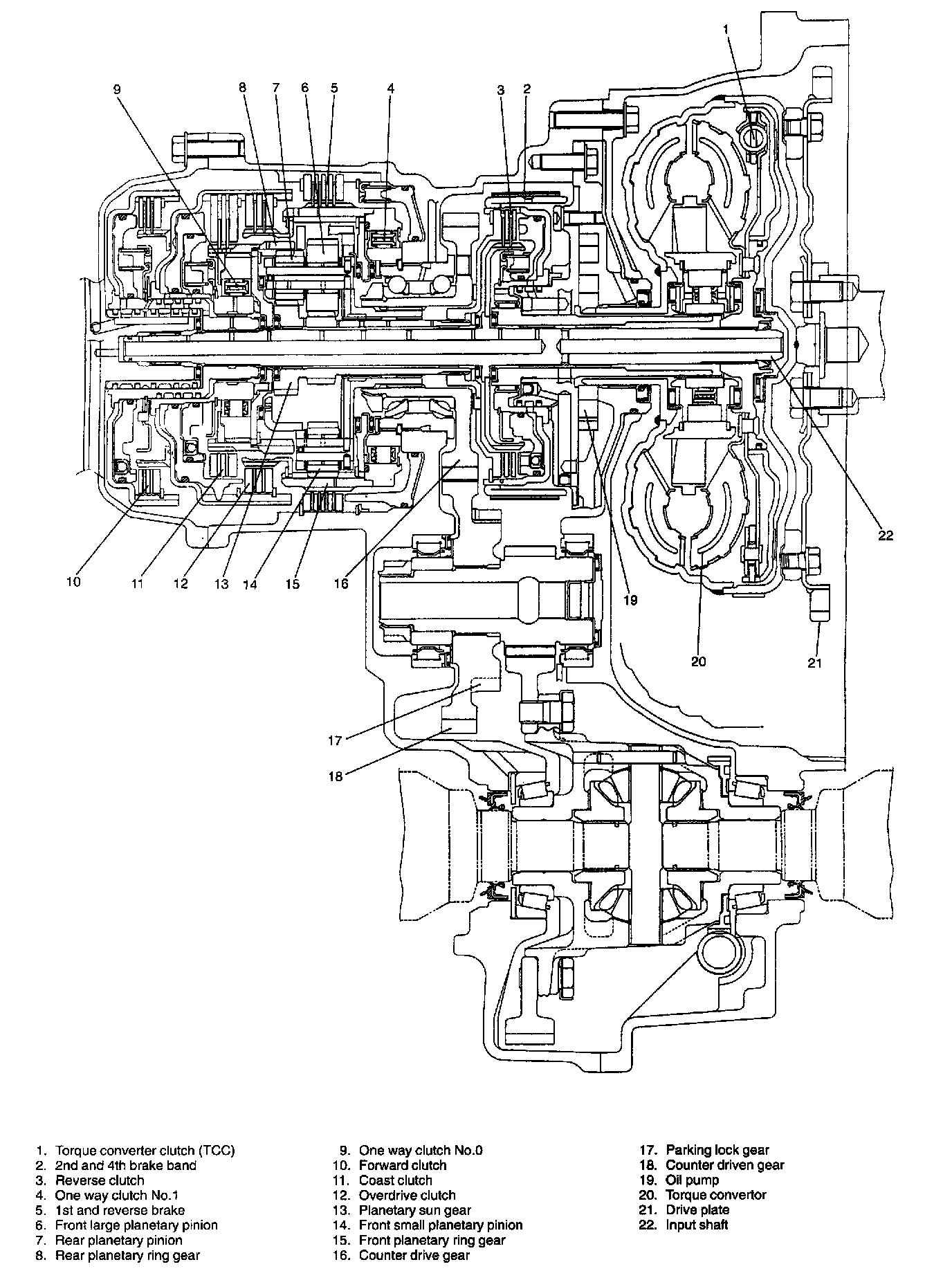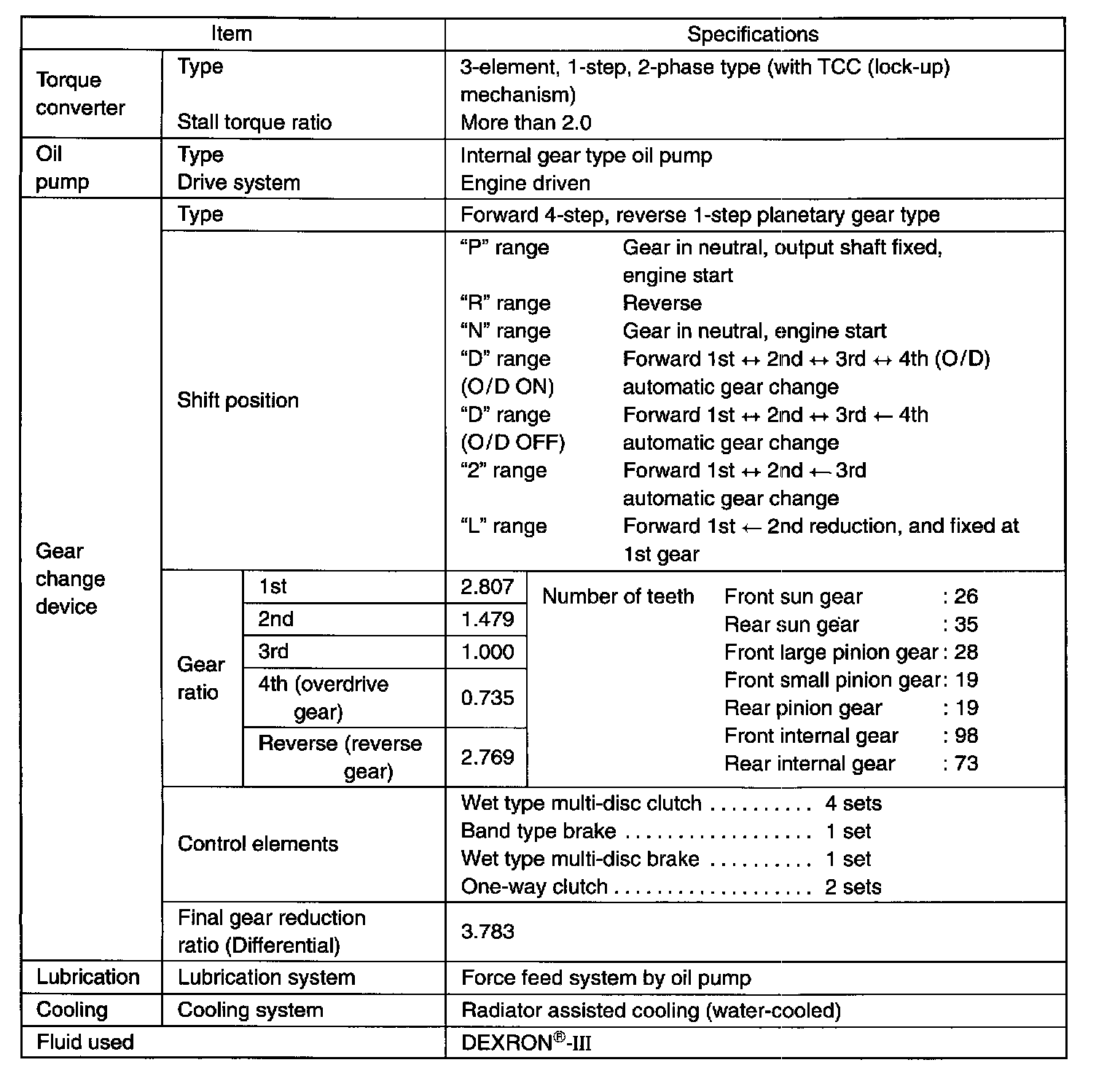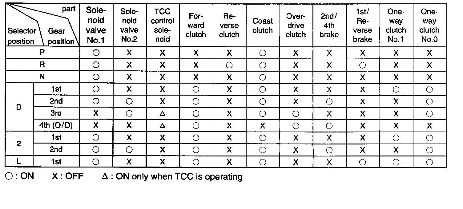 The torque converter is a 3-element, 1-step and 2-phase type and is equipped with an electronically controlled lock-up mechanism. The gear shift device consists of 2 sets of planetary gear units, 4 disc type clutches, a disc type brake, a band type brake an 2 one-way clutches. The gear shift is done by selecting one of 6 positions ("P", "R", "N", "D", "2" and "L") by means of the select lever installed on the floor. On the shift knob, there is an overdrive (O/D cut switch which allows shift-up to the overdrive mode and shift-down from the overdrive mode.
