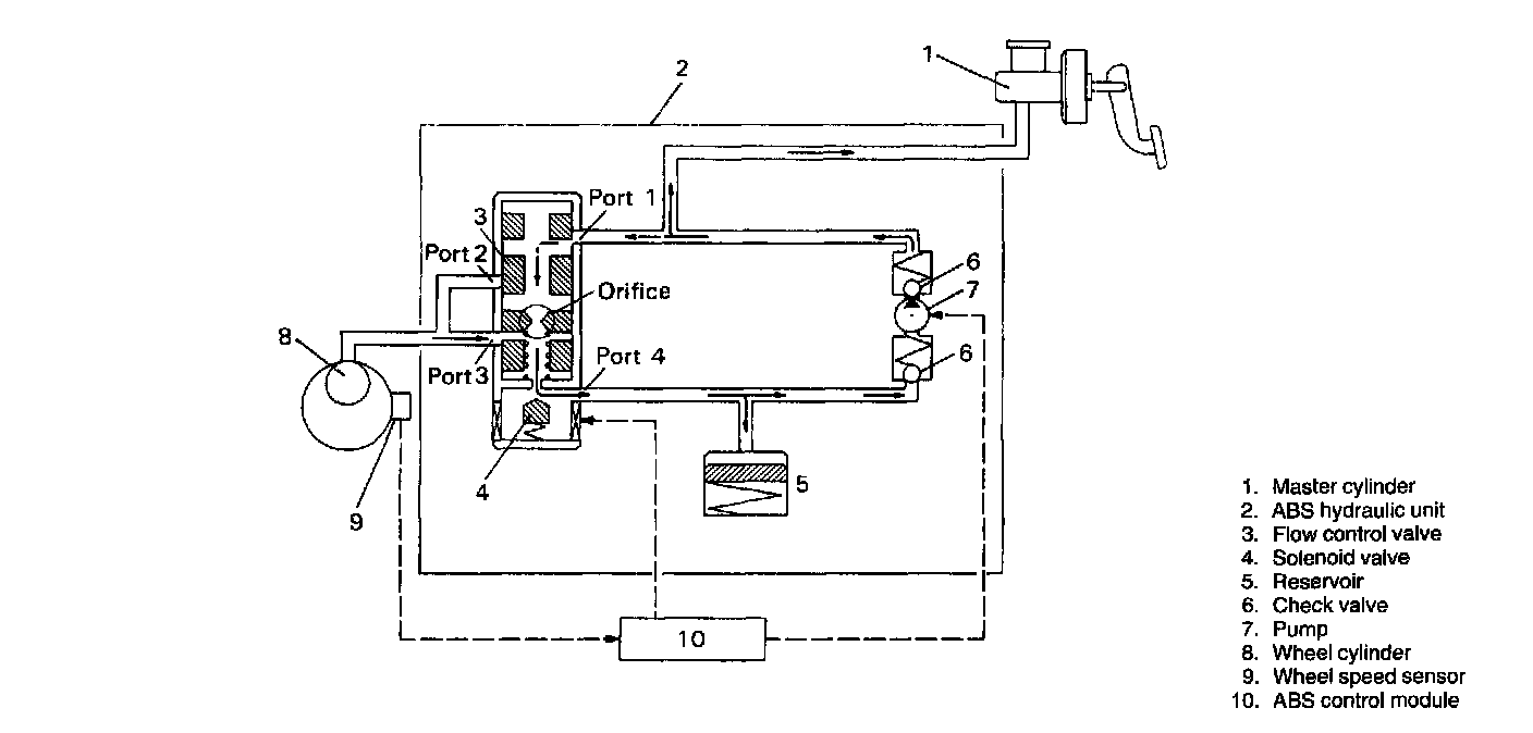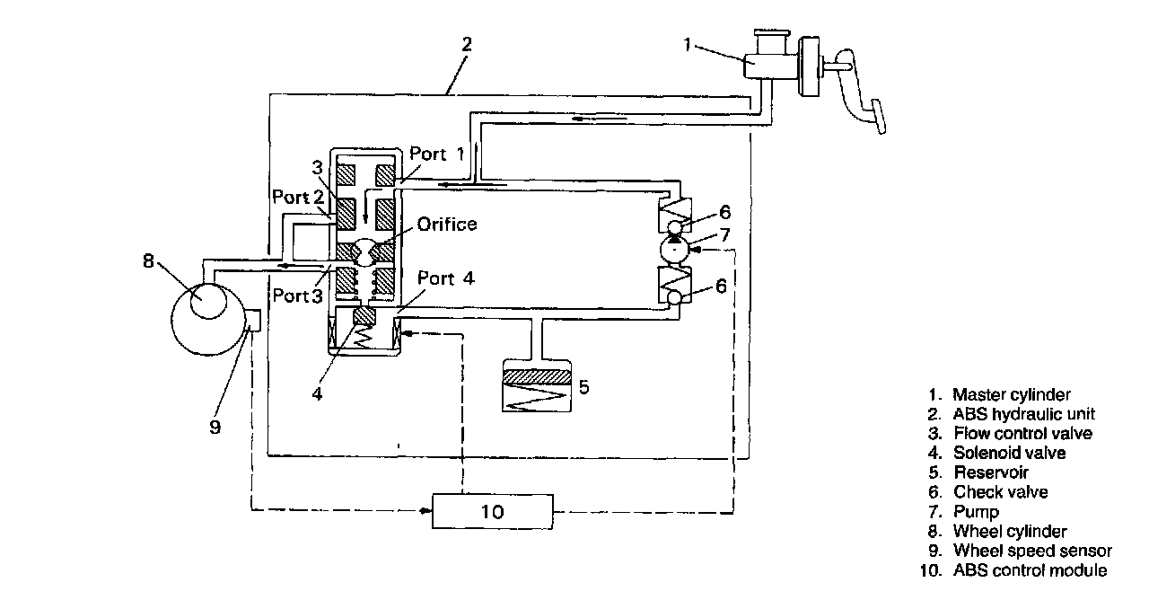 When the wheel is about to lock, ABS control module opens the solenoid valve. At this time the brake fluid which remained under the orifice flows through Port 4 into the reservoir. Then, the pressure under the orifice becomes lower than that above it and the flow control valve is pushed down. As a result, Port 2 is closed to shut off the fluid pressure (fluid flow) to the wheel cylinder for an instant.