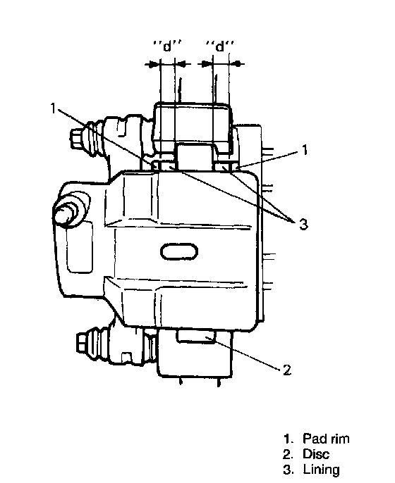 BRAKE PAD LINING CHECKInspect pad linings periodically according to maintenance schedule whenever wheels are removed (for tire rotation or other reason). Take a look through hole of caliper and check lining thickness of inside pad.