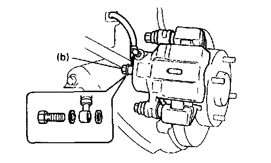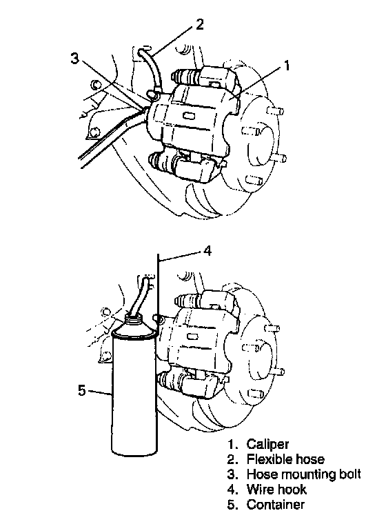 2. Remove brake flexible hose mounting bolt from caliper. As this will allow fluid to flow out of hose, have a container ready before hand.