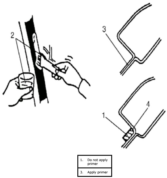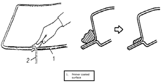 If surfaces of paint or bare metal come out, apply primer (2) for body with caution not to apply primer to surface of adhesive remaining on body.