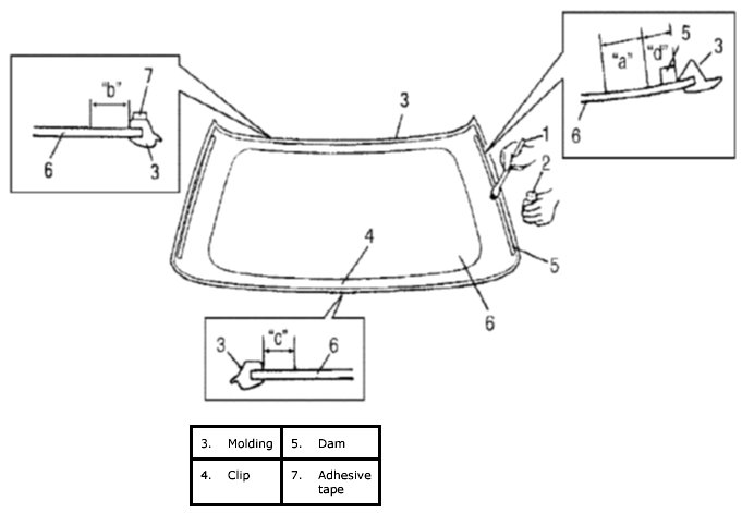 4. Using new brush (1), apply sufficient amount of primer (2) for glass along glass surface to be adhered ("a", "b" and "c" in the figure) to window.