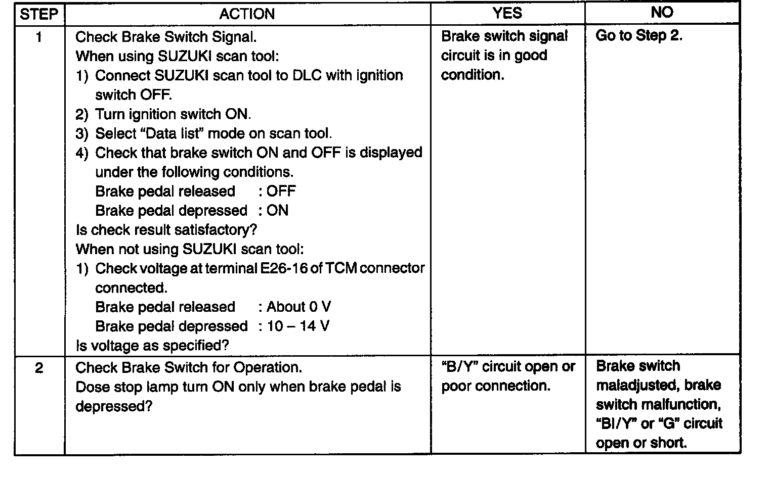 Table B-2 Brake Switch (Stop Lamp Switch) Circuit Check