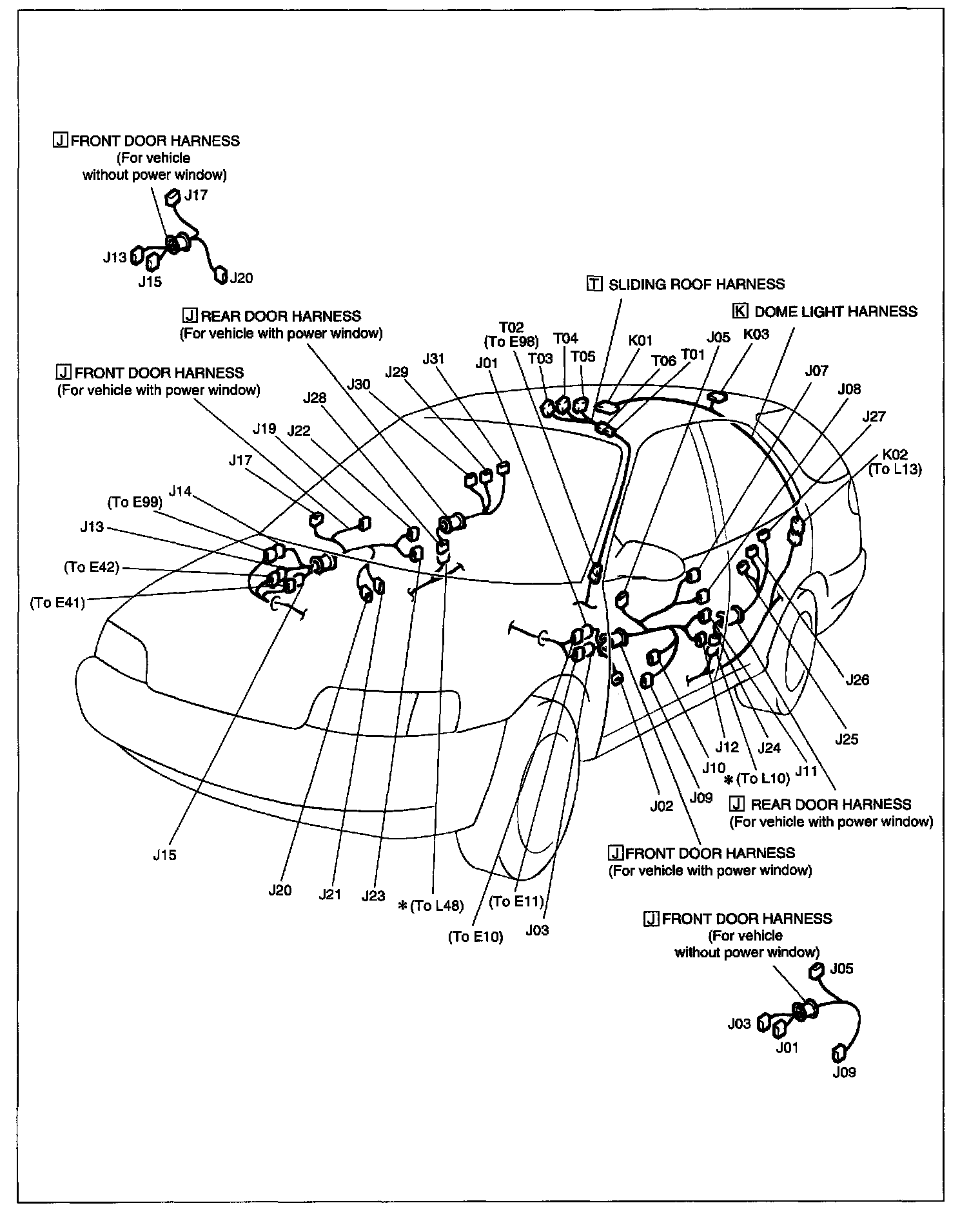 J: Front And Rear Door Harness, K: Dome Light Harness, T: Sliding Roof Harness (For Wagon):