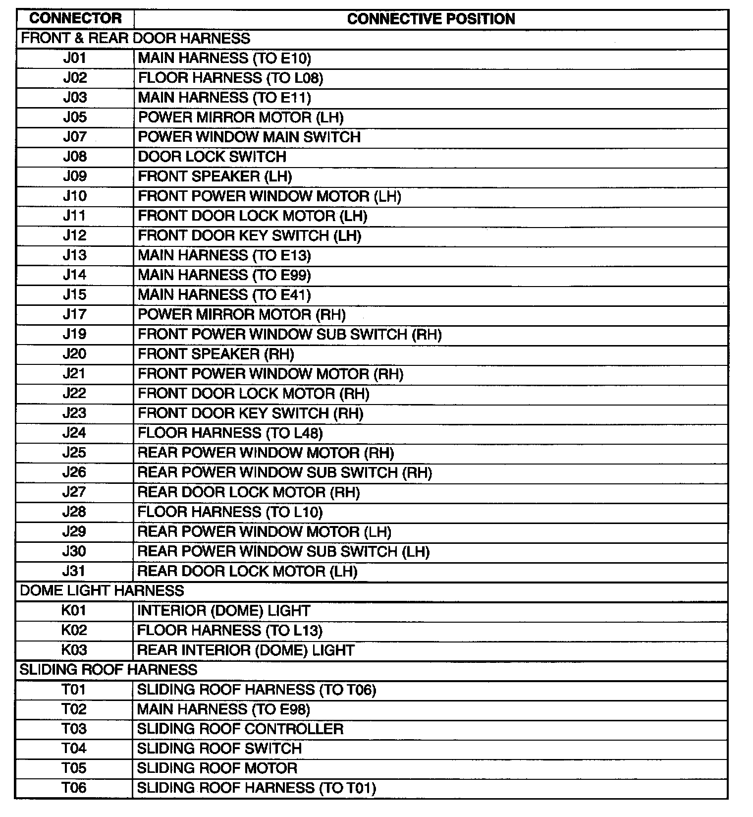 J: Front And Rear Door Harness, K: Dome Light Harness, T: Sliding Roof Harness (For Wagon) Connectors: