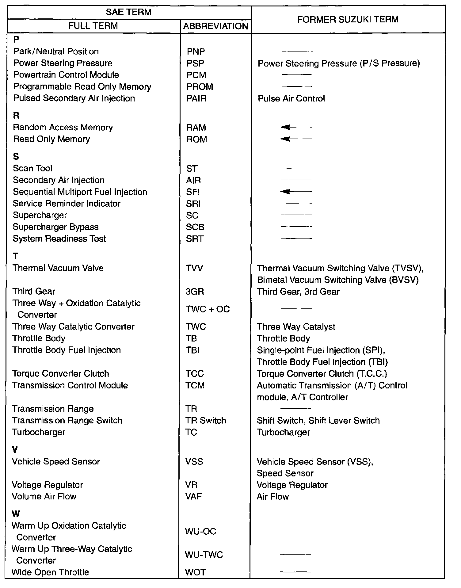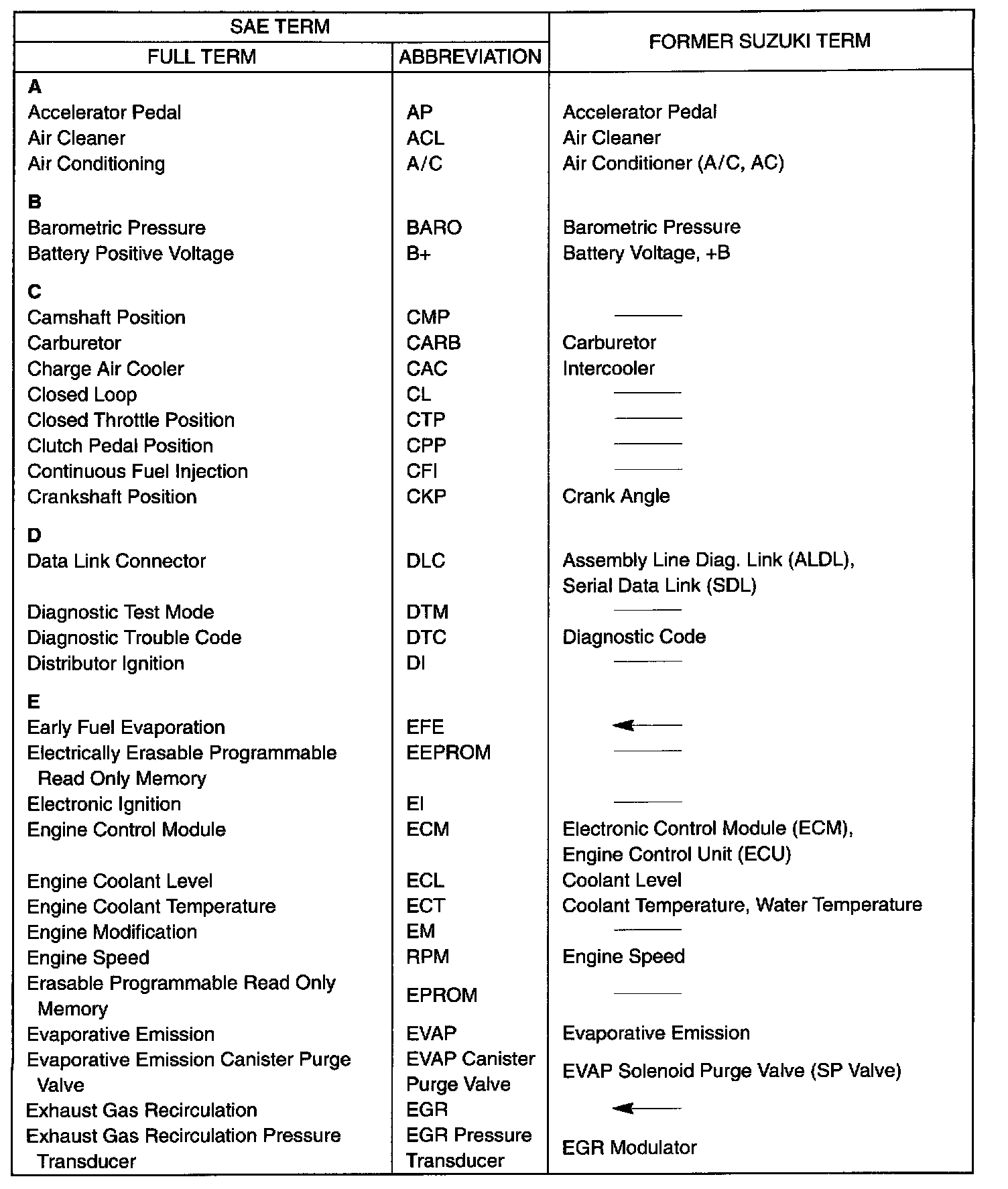 This table lists SAE (Society of Automotive Engineers) J1930 terms and abbreviations which may be used in compliance with SAE recommendations, as well as their former SUZUKI names.