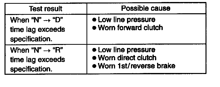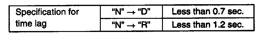 TIME LAG TESTThis test is to check conditions of clutch, reverse brake and fluid pressure. "Time lag" means time elapsed since select lever is shifted with engine idling till shock is felt.