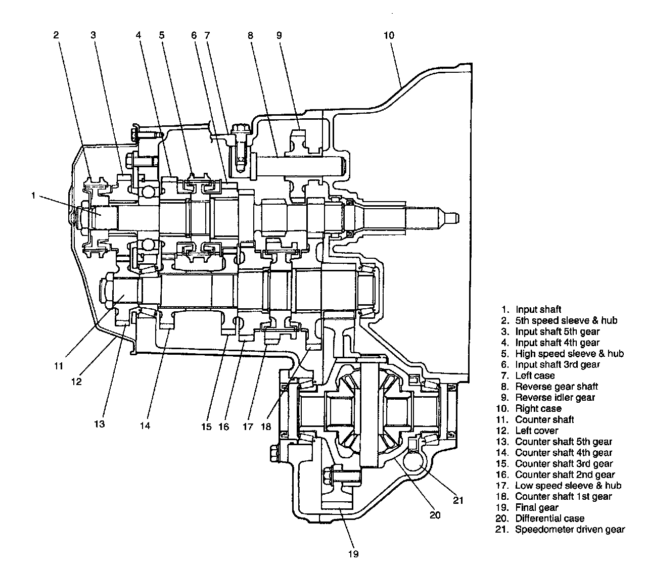 The transmission provides five forward speeds and one reverse speed by means of three synchronizers and three shafts: input shaft, counter shaft and reverse gear shaft. All forward gears are in constant mesh, and reverse uses a sliding idler gear arrangement.