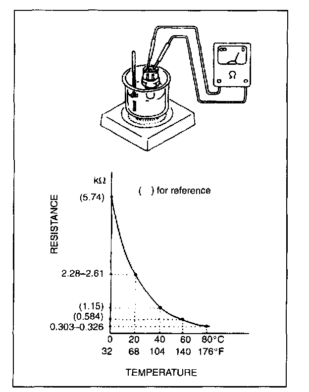 Immerse temperature sensing part of ECT sensor in water (or ice) and measure resistance between sensor terminals while heating water gradually.