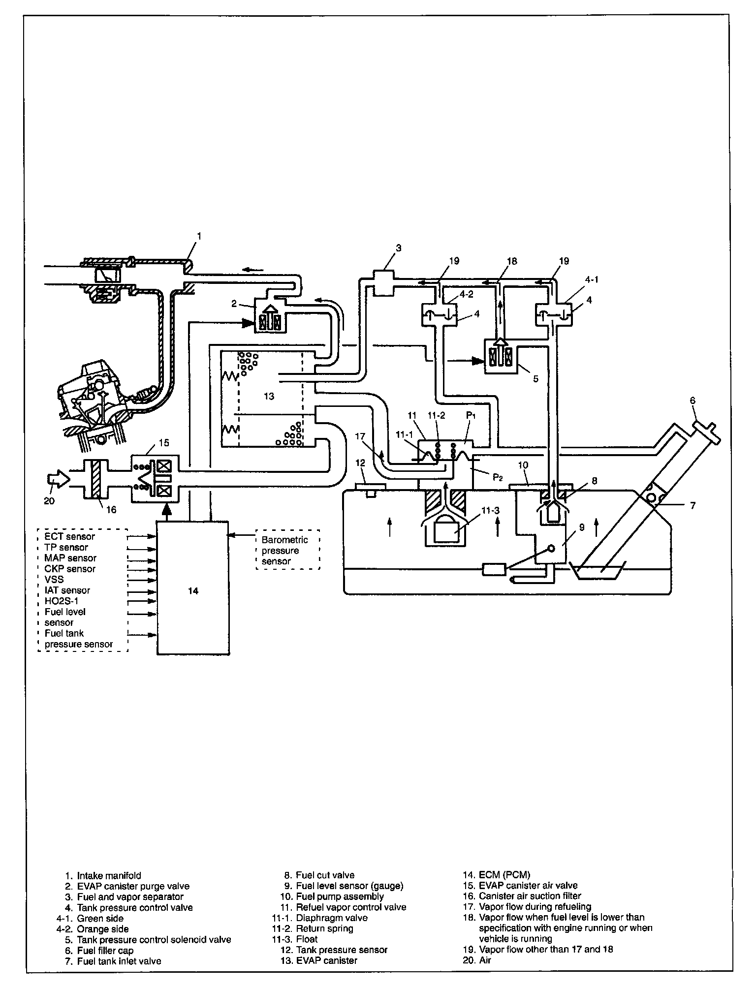 The EVAP canister air valve and the fuel tank pressure sensor among the component parts are installed so that ECM (PC M) diagnoses leakage of the fuel vapor from the evaporative emission control system. The EVAP canister air valve is usually open but it is closed by ECM (PCM) when checking such leakage.
