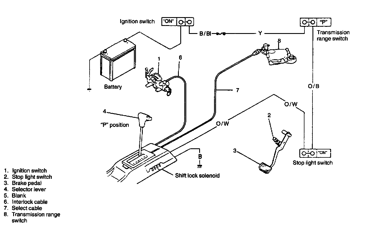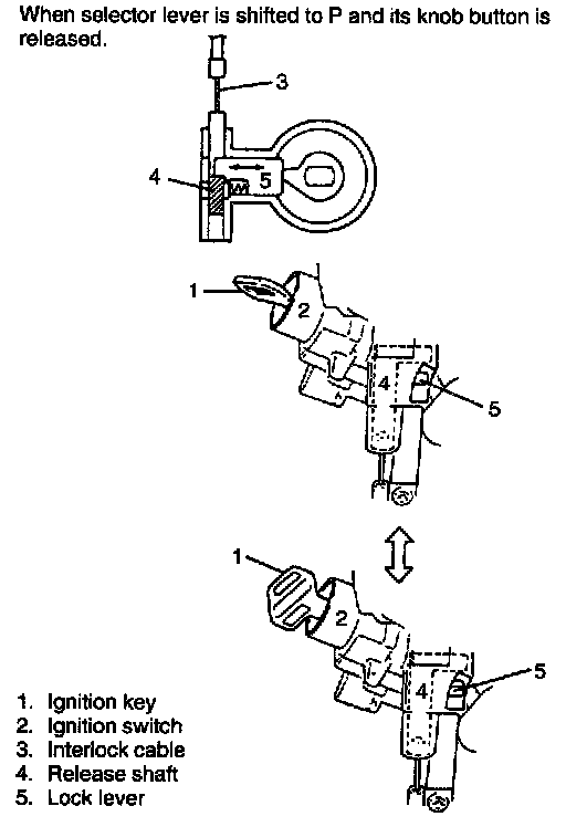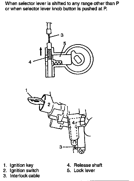 This system is so designed that select lever cannot be shifted from "P" range position unless the ignition switch is turned to "ON" and brake pedal is depressed. Also, ignition key cannot be pulled out of key hole unless selector lever is in "P". These mechanism are as follows.