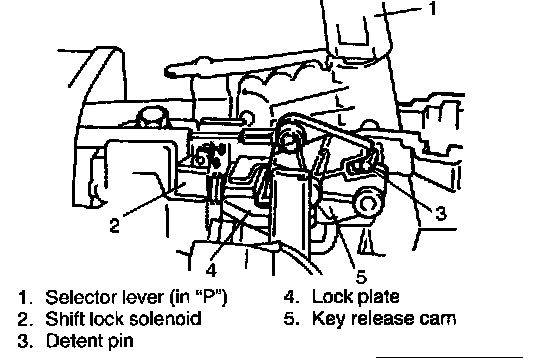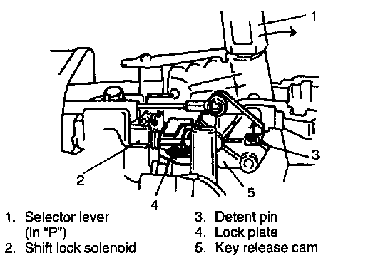 When the select lever is in "P" range, the ignition key position is "ON" and depressing the brake pedal cause the electric current to flow to the solenoid. As the lock plate is drawn toward the solenoid in this state, it frees the key release cam and detent pin, which then allows the select lever to be shifted from "P" range to any other position.