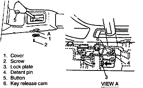2. Turn ignition key to "ACC" position and move lock plate toward front side of vehicle by using screw driver or the like until key release cam and detent pin becomes free.