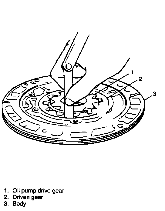 2. Install driven gear and drive gear to pump body after applying fluid to gears.