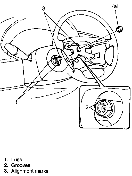2. Install steering wheel to steering shaft with 2 lugs on contact coil fitted in two grooves in the back of steering wheel and also aligning marks on steering wheel and steering shaft.