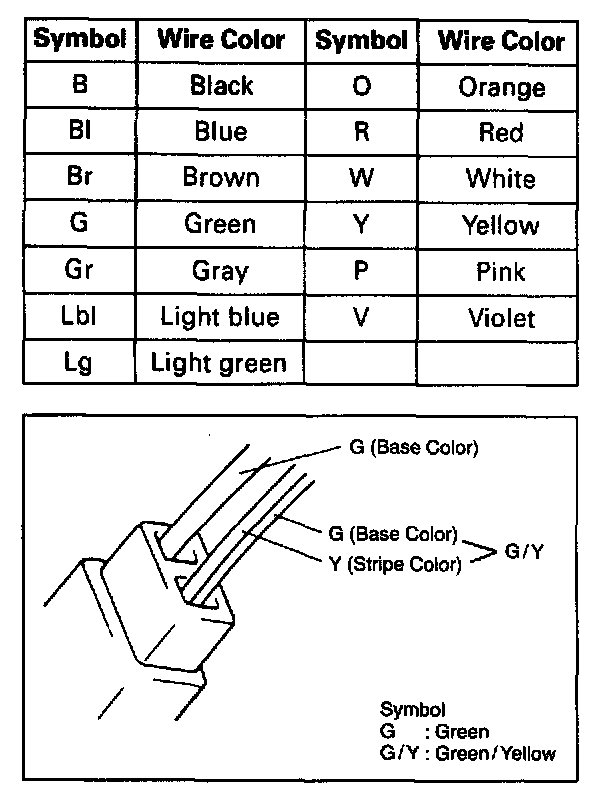 There are two kinds of colored wire used in this vehicle. One is single-colored wire and the other is dual-colored (striped) wire. The single-colored wire uses only one color symbol (i.e. "G"). The dual-colored wire uses two color symbols (i.e. "G/Y"). The first symbol represents the base color of the wire ("G" in the figure) and the second symbol represents the color of the stripe ("Y" in the figure).