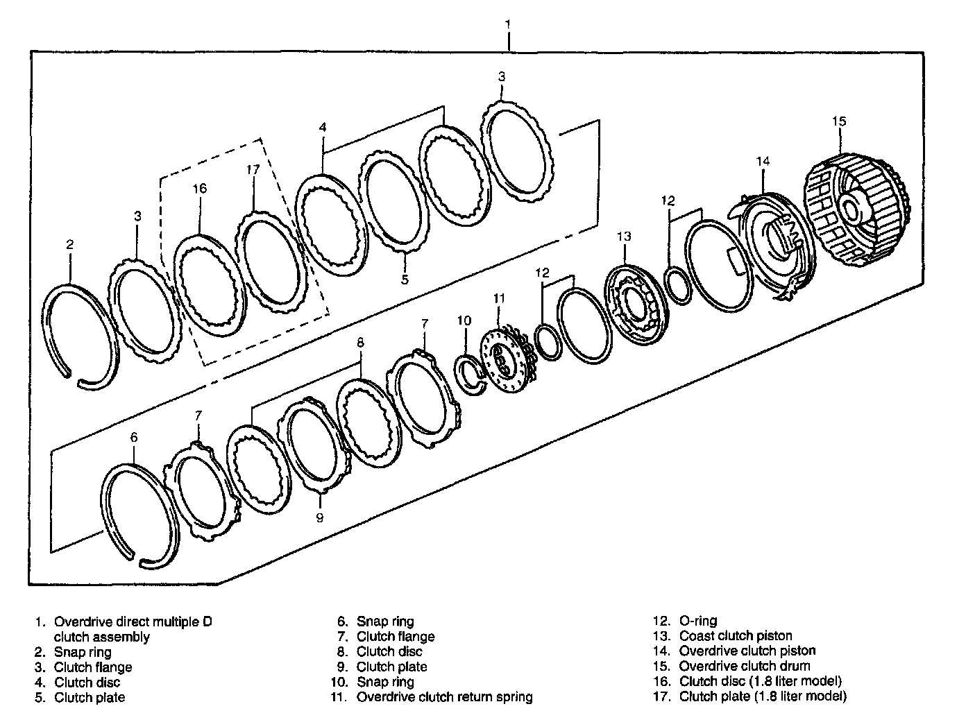 10. Install flanges, discs and plate of overdrive clutch in following order.