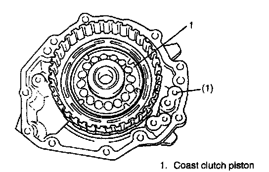 6. Remove coast clutch piston with O-rings using compressed air (400 - 800 kPa, 4 - 8 kg/cm2, 57 - 113 psi) through oil hole (1).