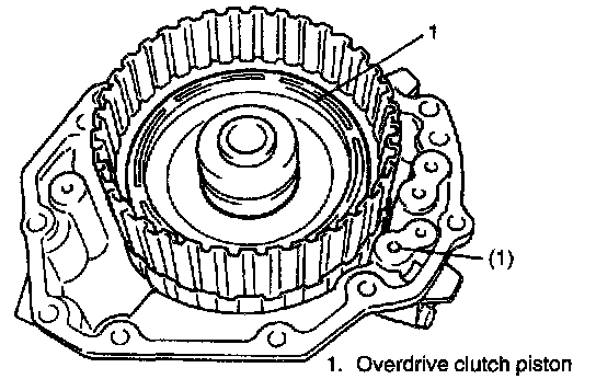 8. Remove overdrive clutch piston with O-rings using compressed air (400 - 800 kPa, 4 - 8 kg/cm2, 57 - 113 psi) through oil hole (1).