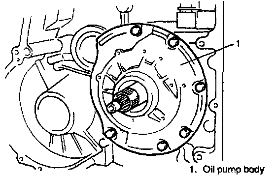 61. Tighten oil pump body with six bolts.